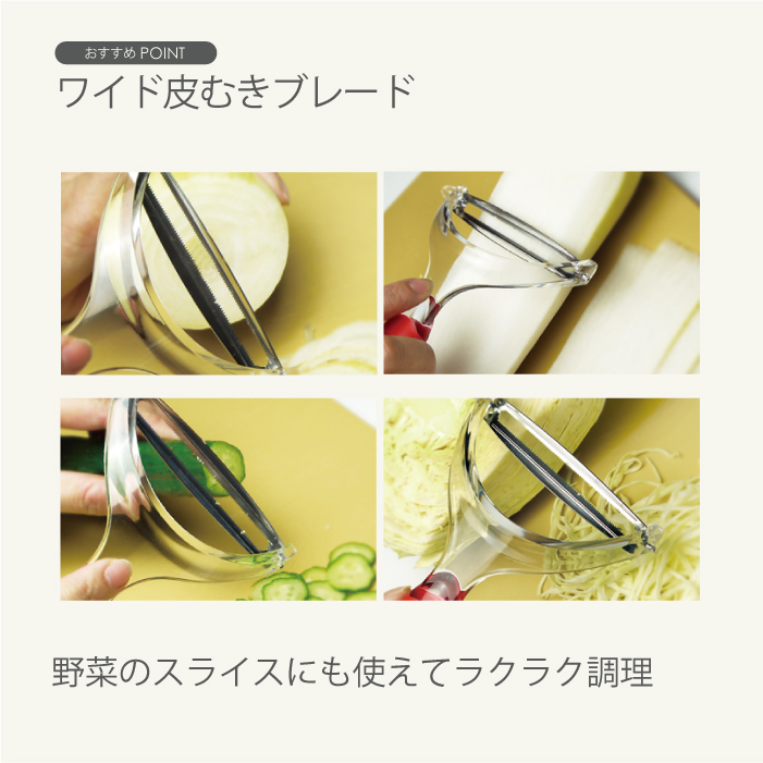 皮むきピーラーです。皮むきがラクチンなのは当たり前ですが、それだけでなくスライサーとして使うのがものすごく便利です。そのために、幅広タイプ・ギザ刃・細切り専用刃などいろんなバリエーションを取り揃えています。